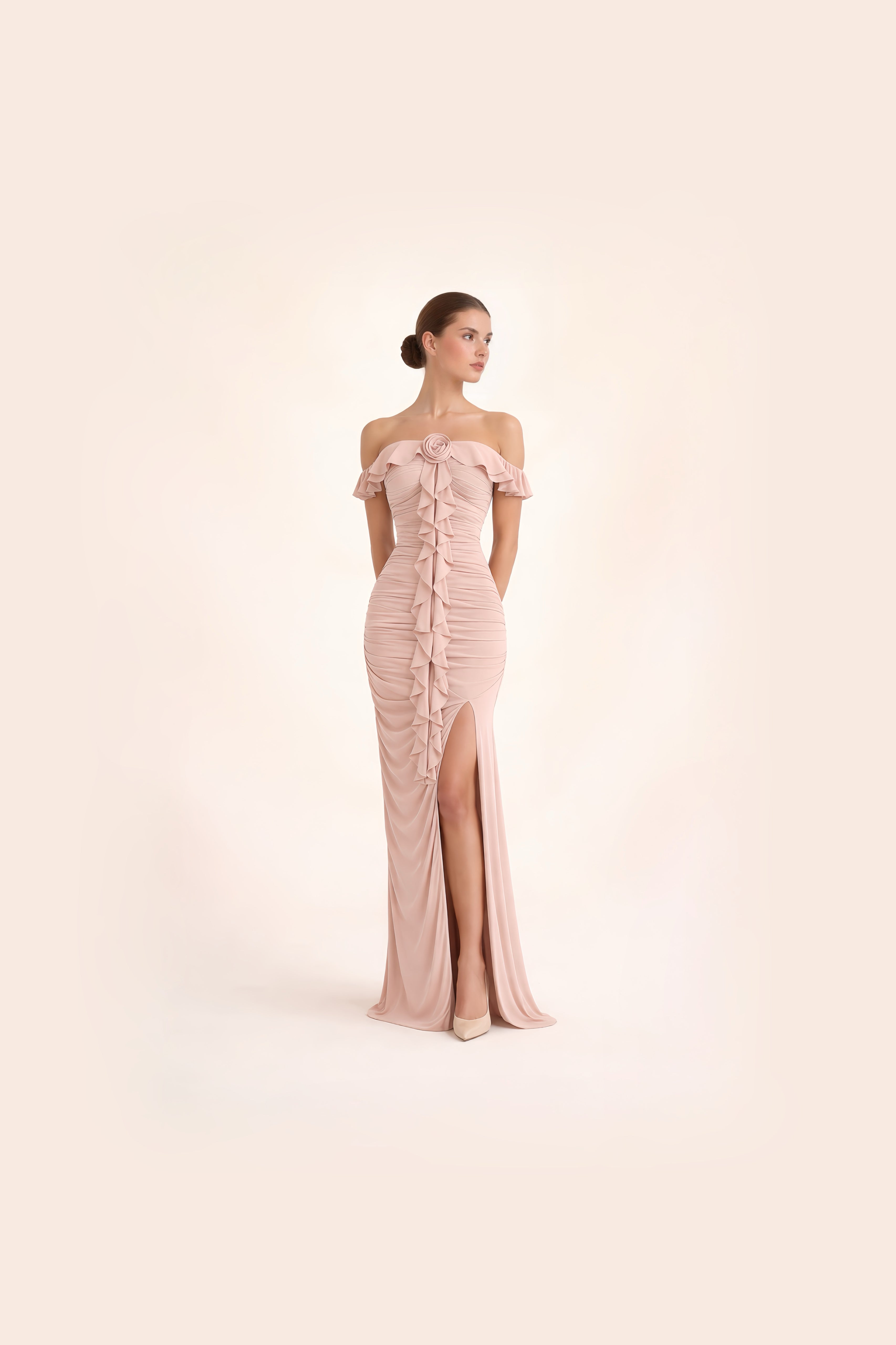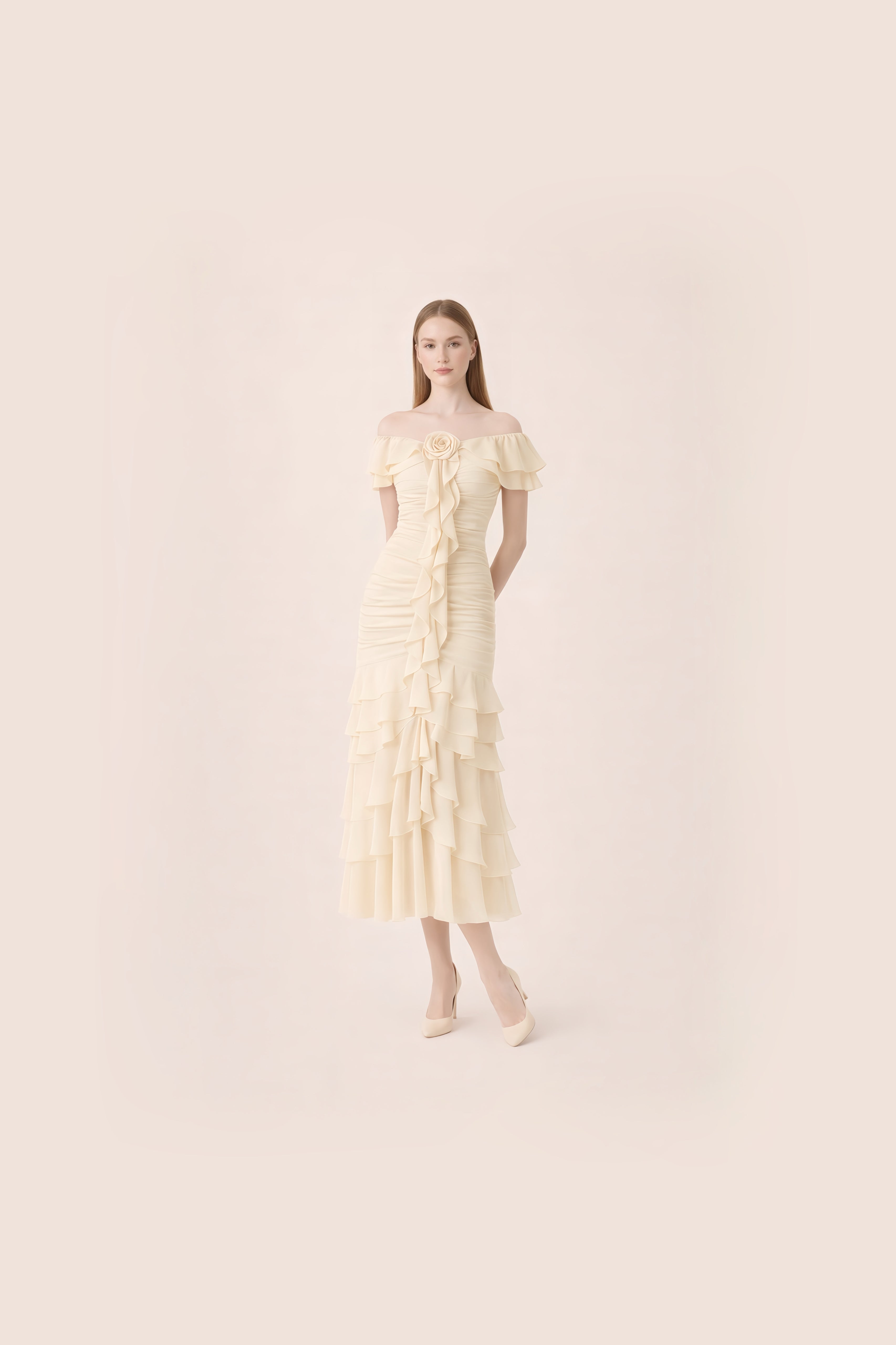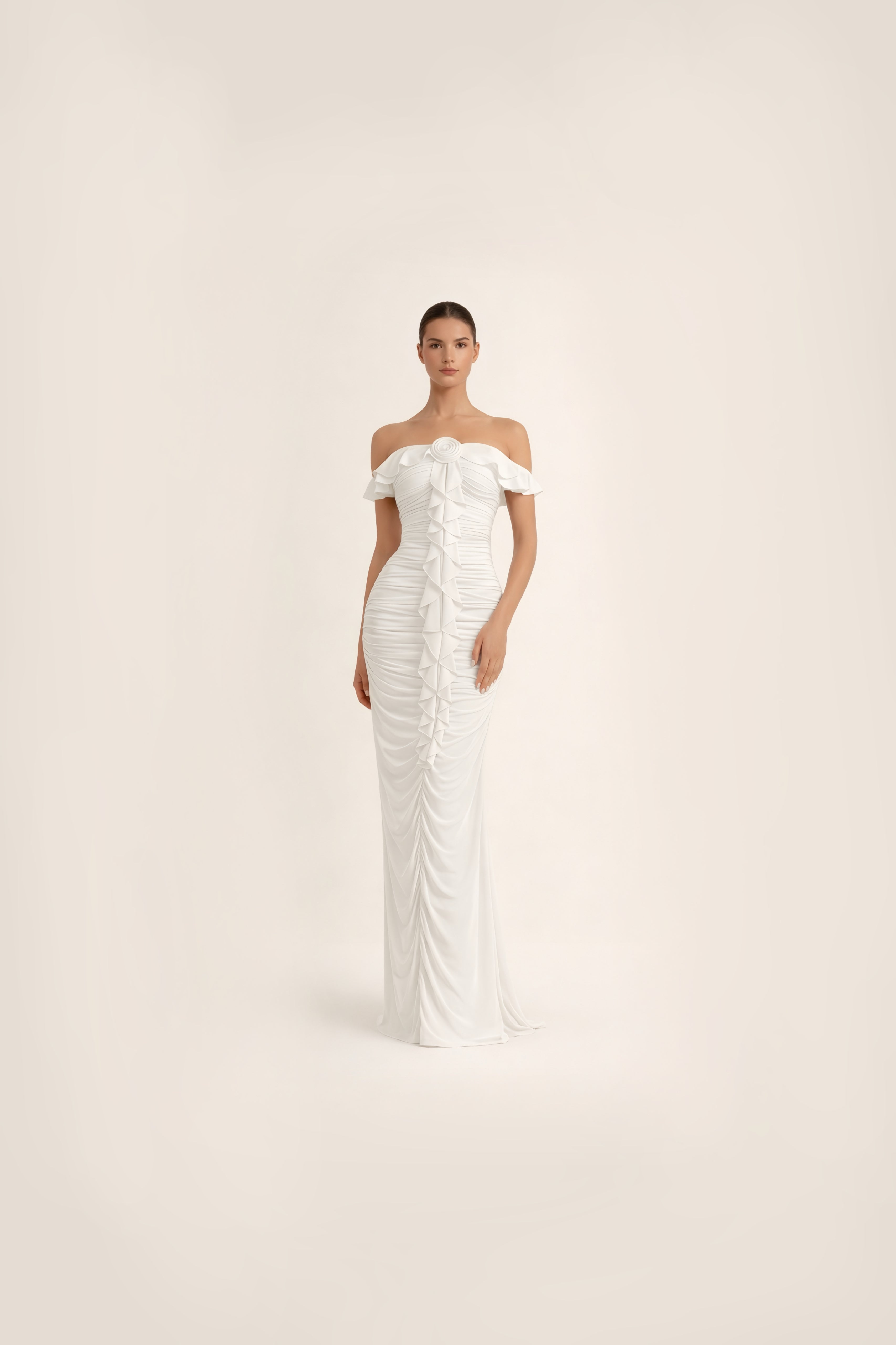 An off-shoulder silhouette finished with cascading ruffles for timeless elegance